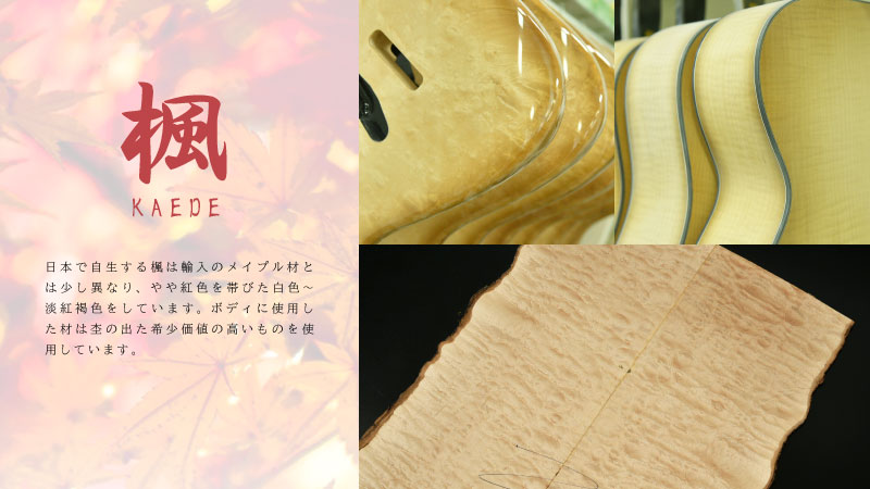 ディバイザーでは積極的に日本の木「和材」を使用したギターを制作しています。北米のメイプルにも近いこの木材は、木肌が他の樹種に比べて白く、木目が美しいこともあり、ギターに限らず様々な木工芸品に高級木材として使われています。メイプルを素材に用い、デザインも四季の中でも一際色彩が豊かな「秋」デザインコンセプトに据え、Headwayのアコースティックギターをはじめ、BacchusやMomoseのエレキギター・エレキベースにて製作を行っています。