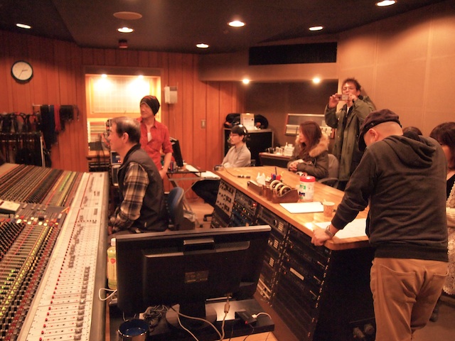演奏の録音が一段落するとコンソールルームに移動して、録音したプレイバックを聞きます。ファンの方々も小人数ずつコンソールルームに入って立ち会います。ミュージシャンで無い一般の方々にとってはこんなに沢山のレコーディング専用機材に囲まれた部屋に入れる機会は中々ありません。