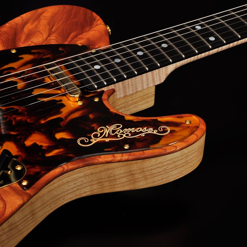 木目が美しい木材ですが、玉杢、泡杢といった地味目な杢が多いなか、このギターに使用された欅は、根元近くにでた杢を見事な木取りで深いフィギュアード材となりました。