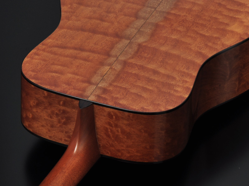 ボディトップに使用した「台湾杉」は通常ヘッドウェイで使用するスプルースと比べて赤く木目にも特徴があり、印象に残る顔立ち。そしてボディサイドバックに使用されるのは極上のキルテッドマホガニー。あまり杢を持つものが少ないマホガニーの中で、ここまでの立体的な木目はめったに見られません。