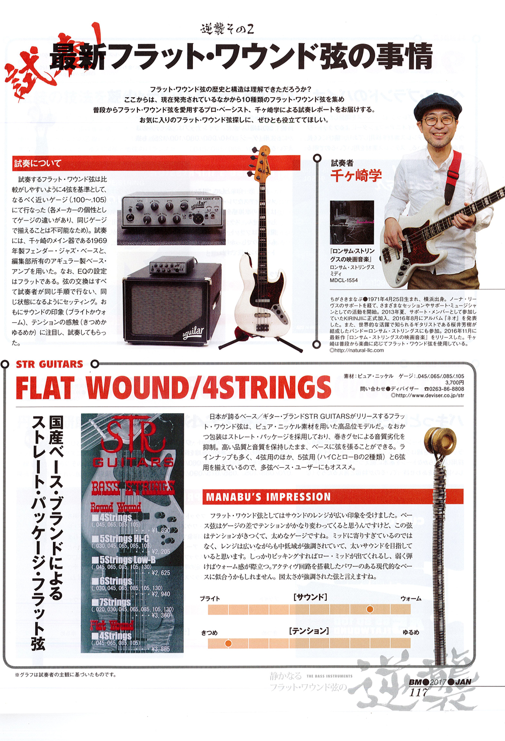 ”静かなるフラットワウンド弦の逆襲”には「STR GUITARS BASS STRINGS FLAT WOUND/4st」が掲載されました。梱包はストレートパッケージを採用しており、巻きグセによる音質劣化を抑えました。4弦の他にも5弦や6弦もラインナップ。ラウンドワウンド弦もラインナップしています。
