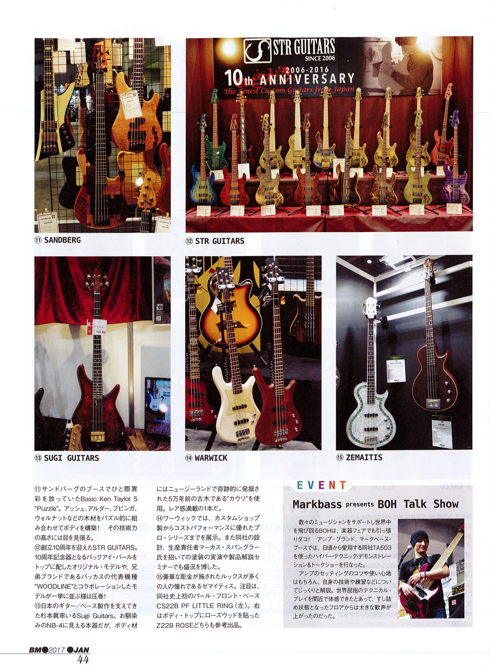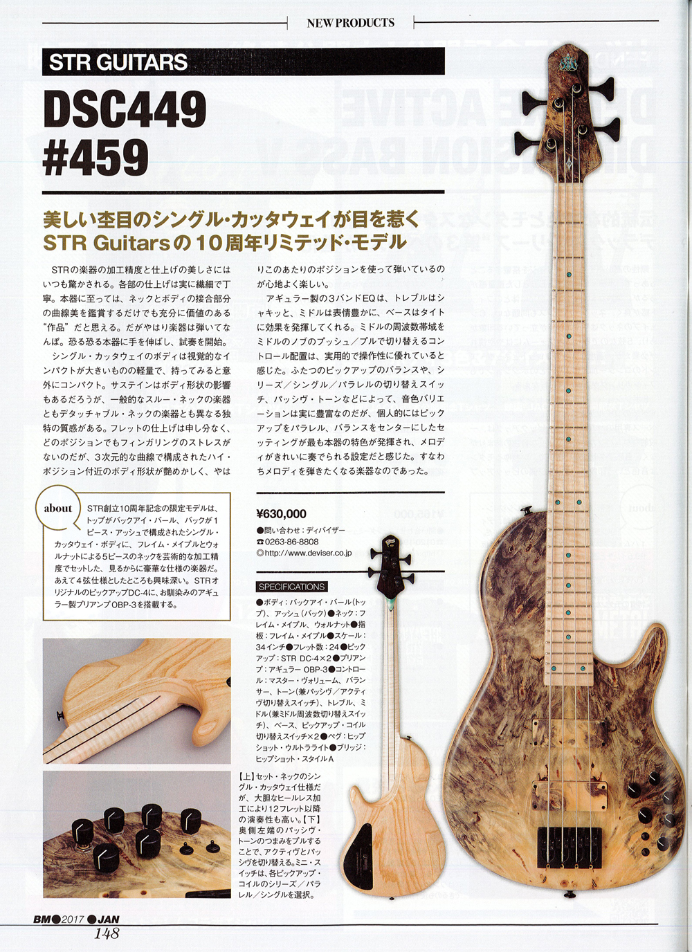 2016年12月19日発売の「ベースマガジン1月号」に、新製品紹介としてSTR Guitars 10周年記念モデル「DSC449 #459」が掲載されています。