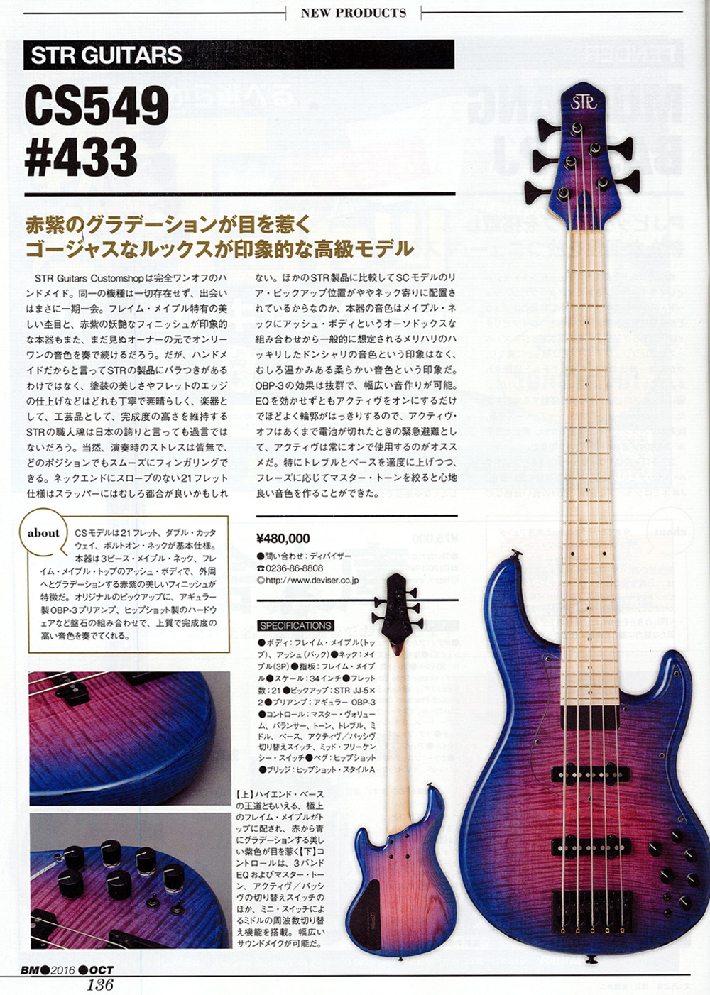 2016年9月17日発売の「ベースマガジン10月号」に、新製品紹介としてSTR GUITARS"CS549 #433"が掲載されています。赤と紫のグラデーションが特徴的で、インパクトのある外観に仕上がっています。 広告にはBacchus GLOBAL Series WLモデルを掲載しています。3種類のスケールから自分に合ったモデルをお選びいただけるラインナップとなっております。 また11月にはニューカラーを発売予定!!お気に入りのカラーをお探しいただけます。 ベースマガジンサイト https://www.rittor-music.co.jp/magazine/bm/ STR GUITARS ウェブサイト http://archive.deviser.co.jp/str Bacchus ウェブサイト http://www.deviser-bacchus.com/ 掲載されたモデルのご紹介 STR CS549 #433 WL ラインナップ 作成者:dev-web3 作成日:2016/9/16(金) 10:16