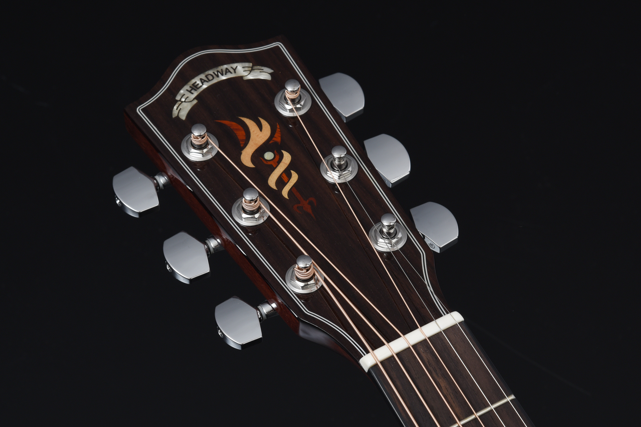天神や指板、ピックガードには桜をモチーフとしたデザインのインレイが施されています。