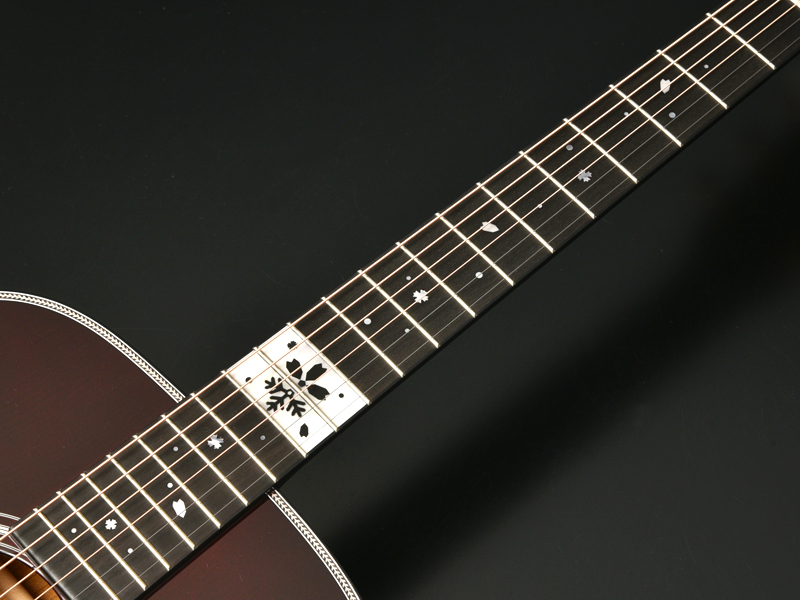 12フレット付近に埋め込まれたインレイとエボニーのコントラストが美しく、桜の花びらと雪の結晶が舞い散る上品なデザインが特徴です。
