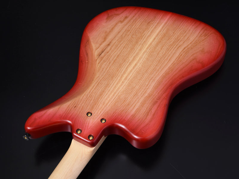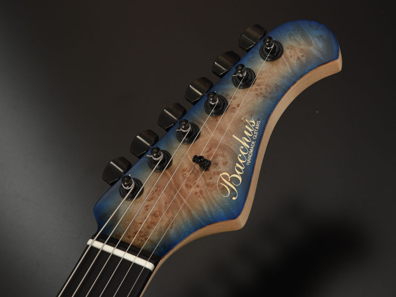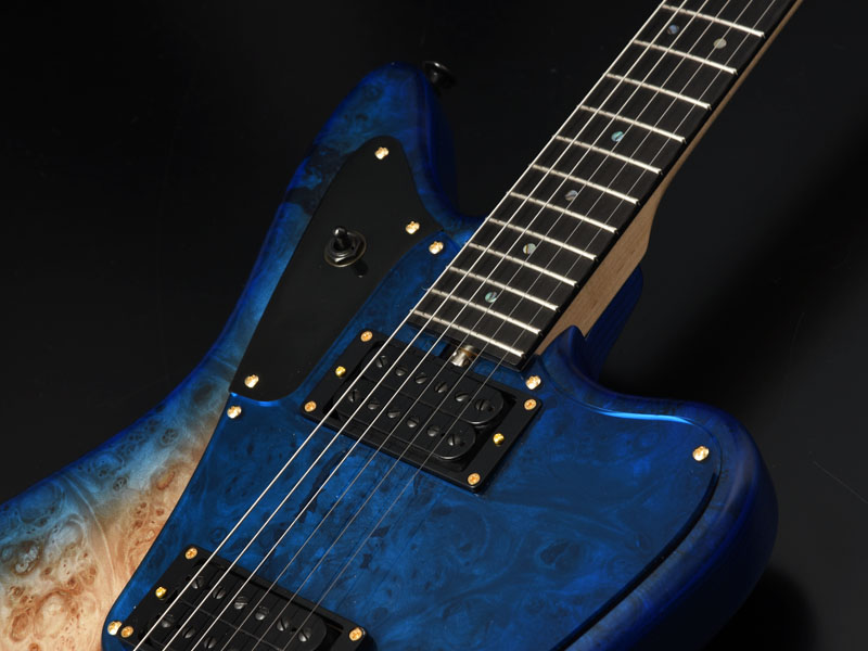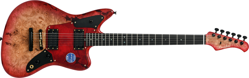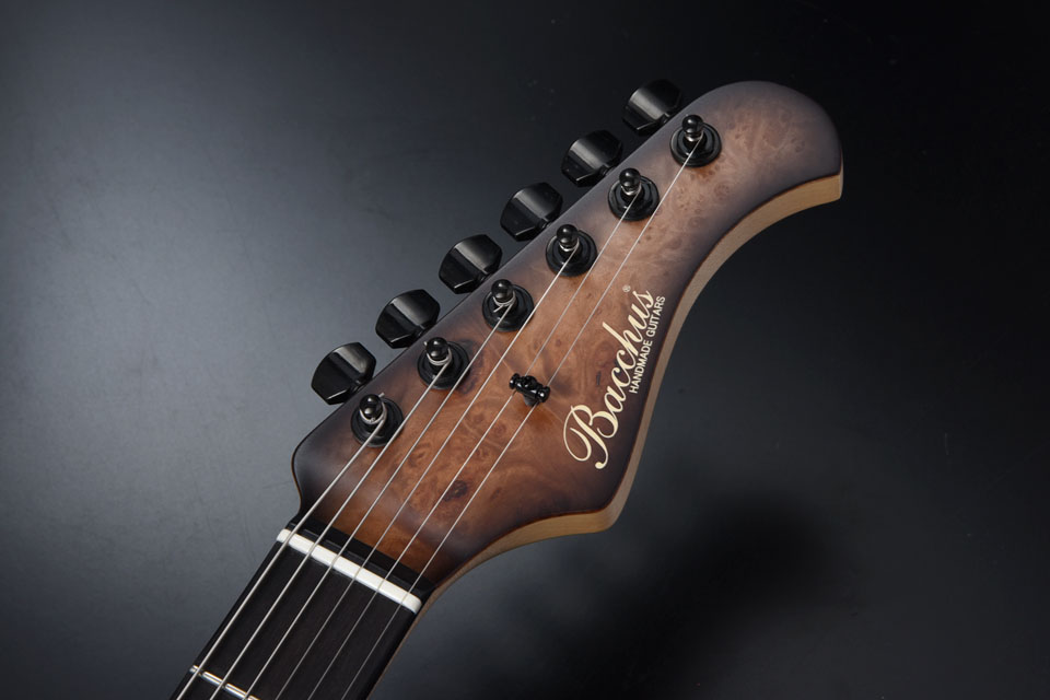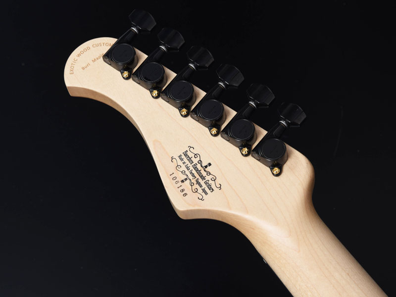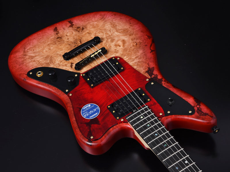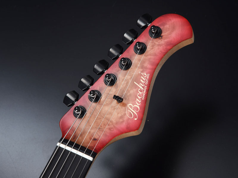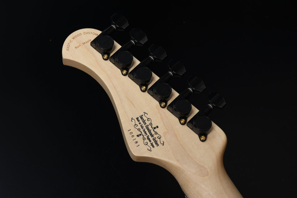 バールメイプルの杢が際立つようにバーストカラーで仕上げ、ヘッド部分もマッチング仕様でバーストを施し丁寧な仕上がりになっています。ピックガードは各モデルのカラーに合わせた1プライのピックガードを採用しました。