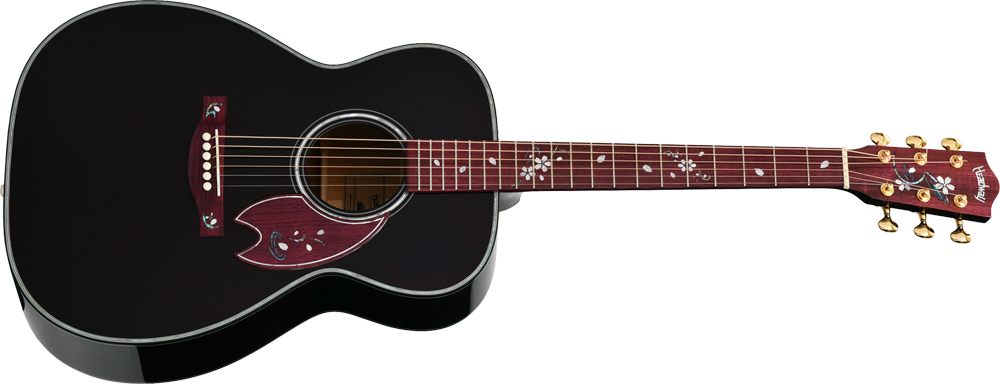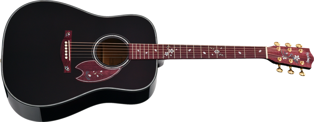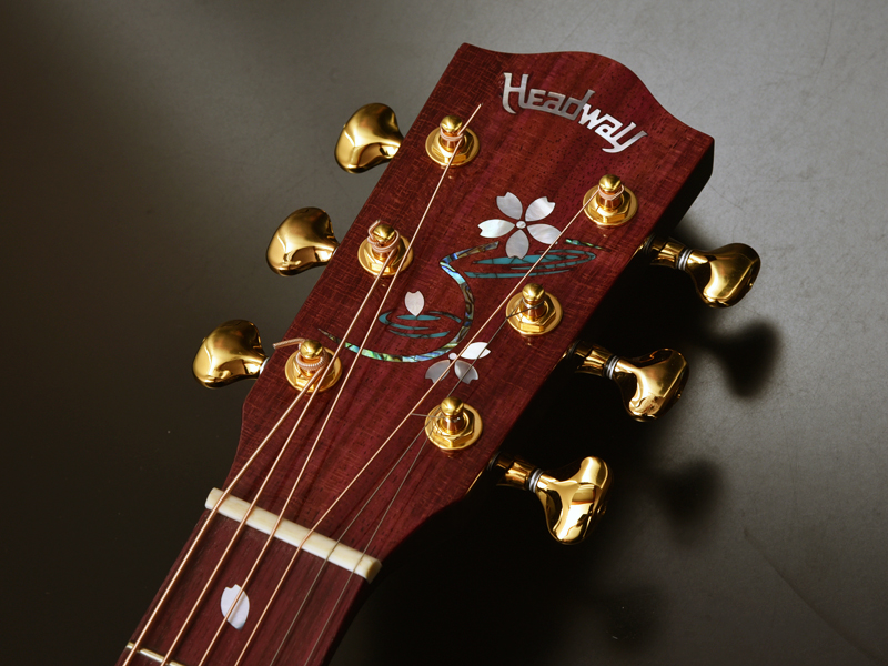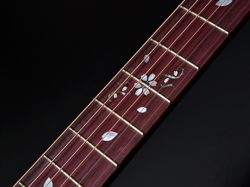 指板やピックガードのインレイには、風に舞い水面に浮かぶ桜をイメージしてデザインされました。