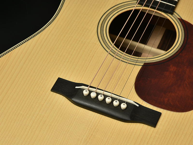 深い赤が印象的なレッドスワールピックガードや大柄ヘリンボーンのボディ装飾、ブリッジピンのアバロンドットなど、細部までこだわった上質なモデルに仕上がりました。