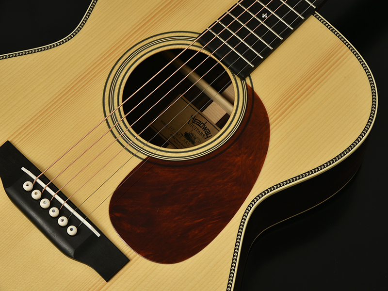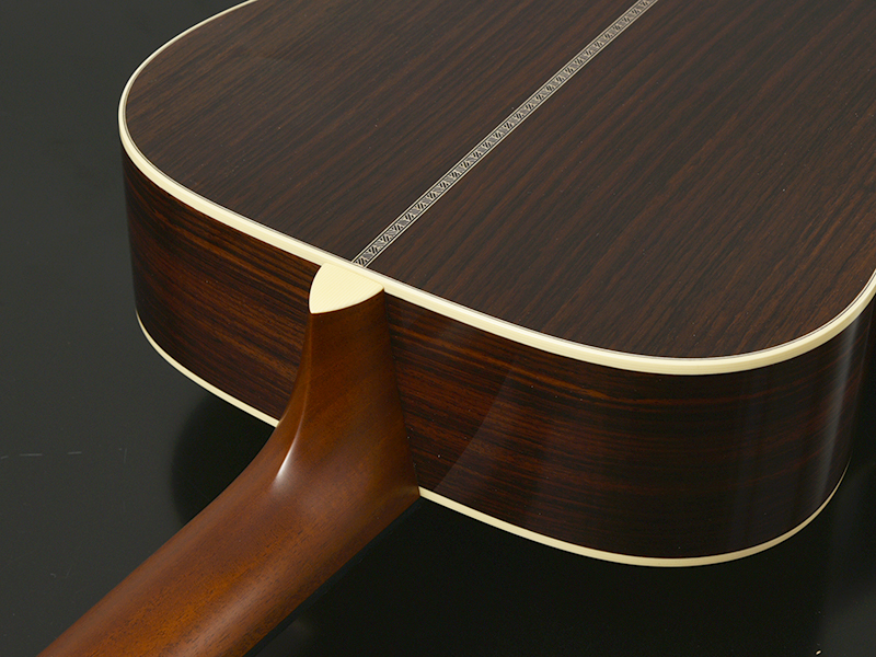 深い赤が印象的なレッドスワールピックガードや大柄ヘリンボーンのボディ装飾、ブリッジピンのアバロンドットなど、細部までこだわった上質なモデルに仕上がりました。素材の希少性ゆえに多くは制作出来ないモデルですが、手に取ればその弾きやすさや所有する喜びを満たしてくれる個性を持った1本です。