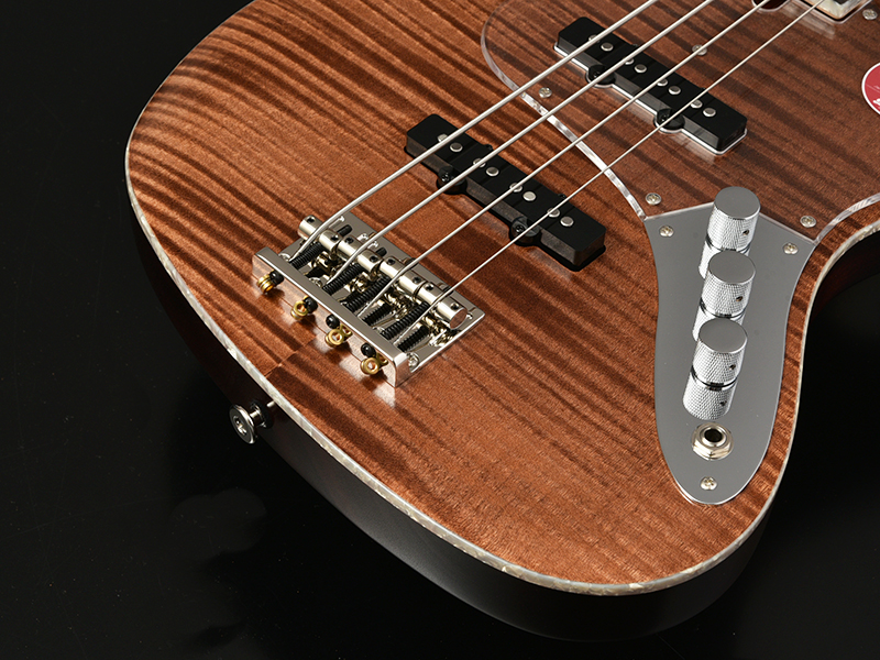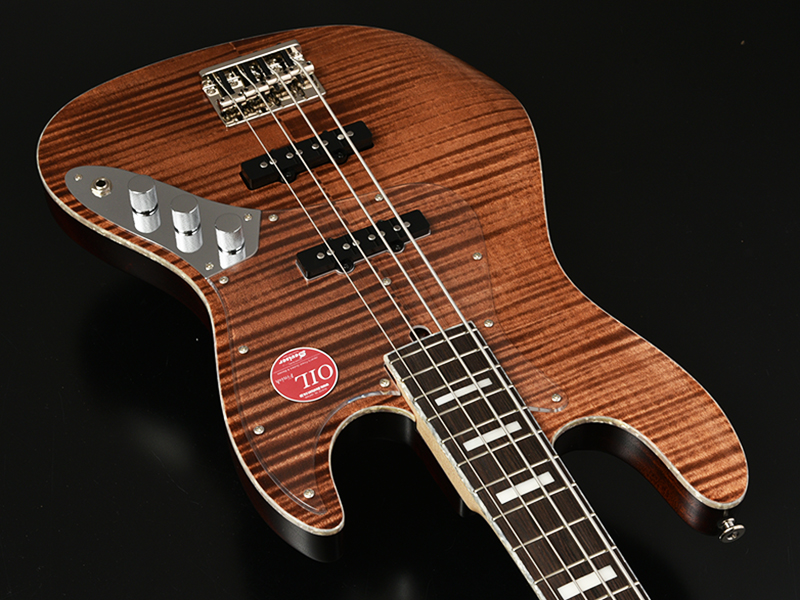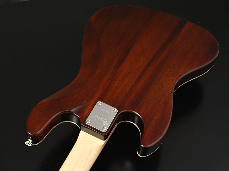 ボディトップには美しい木目が入ったフレイムメイプル、ボディバックにはマホガニーを採用しています。ボディバックはシースルーカラーで塗装されており、トップのカラーリングとマッチした美しい外観に仕上がっています。