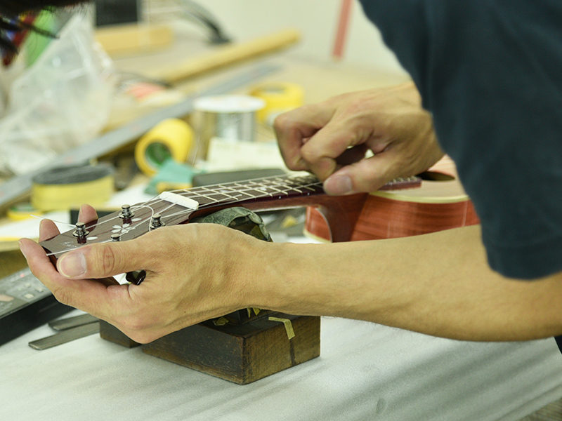 この度のモデルのペグには、GOTOHのステルスキーSTS31-SB3を採用しています。世界最小、最軽量の超小型ペグで楽器ボディとヘッドのバランスもよく、扱いやすい仕様となっています。