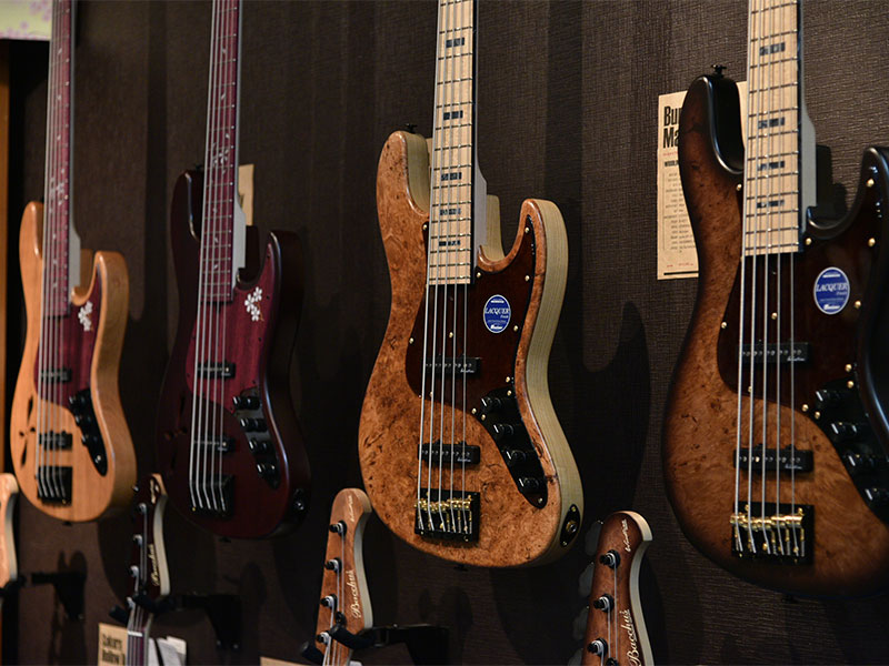 エレキベースは今回すべてアクティブ仕様での製作となりました。定番の4弦MJモデルと片連ペグレイアウトで人気のMJ-Fiveを展示。バックアイバール、桜バール、椿(ツバキ)の他、世界三大銘木の一つで今後入荷が全く予定が立たない希少材「フレイムチーク」をボディトップに使用したモデルを製作しました。