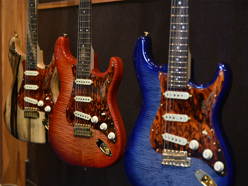 赤松ギターとしても採用されている「Surf Breaker」を各色展示。ジャーマンカーブの特徴的なボディラインを生かして、個性的なソリッドカラーで仕上げました。