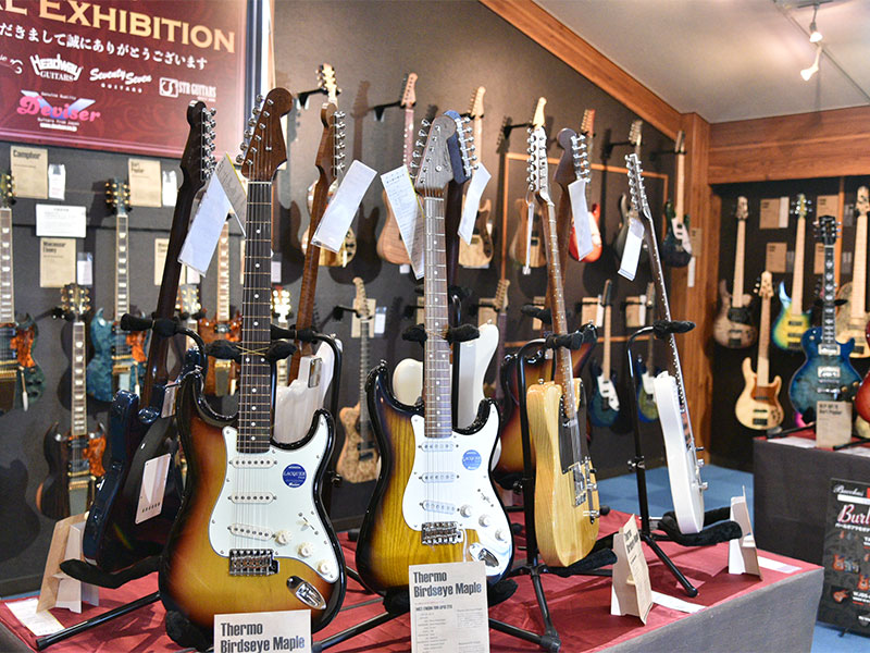サーモウッド・バーズアイメイプルをネックに使用したモデル。ローズネックのモデル、それぞれMST、MTL、MJMを展示しました。