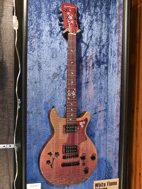 制作本数が少なく希少なモデルとなっているSeventySeven Guitarsの各種モデル。今回の商談会ではALBATROSSをフレイム杢の出た桜材で製作しました。