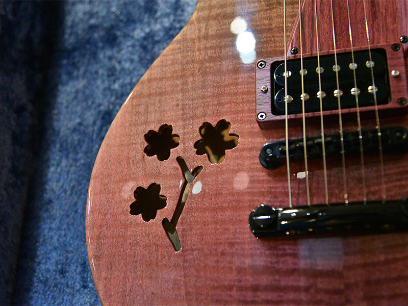 エレキギターでも桜モデルは大人気。今回T-Masterをベースにシンライン構造の桜ボディモデルを製作。ピックガードにはパープルハートに桜のインレイを入れ、サウンドホールも桜の花びらをモチーフにしました。