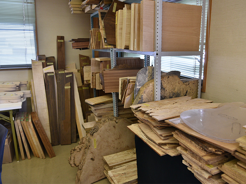 楽器の展示だけではなく、ファクトリーの製作風景もご覧いただけます。ご来場者の方は木材ストックをクラフトマンと選びながら、オーダーギターの企画を打ち合わせることも可能です。