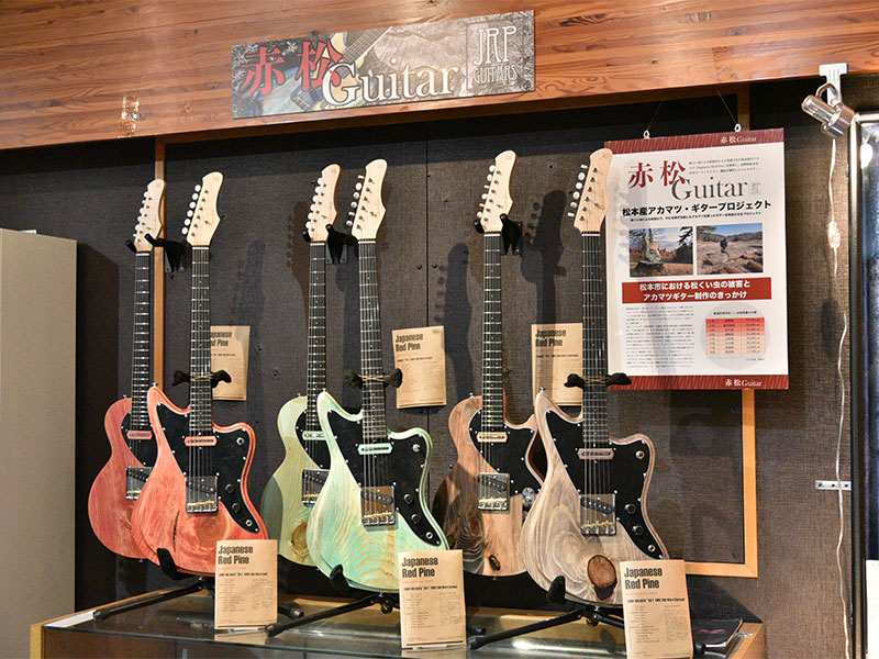 2018年2月に伐採した木材を使用した製品版を2シェイプx3カラーの計6本展示しました。赤松ギターについて詳しくはこちらのページを御覧ください。