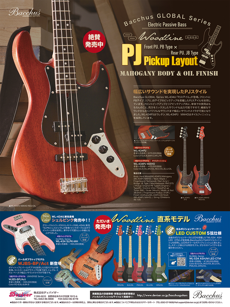 リットーミュージック刊 ベースマガジン8月号発売! 2018年7月19日発売のリットーミュージック刊ベースマガジン8月号にBacchus Global Series製品が掲載されております。 新製品紹介には「WL-434PJ MAHO RED/OIL」が掲載。 掲載モデルはマホガニーボディの4弦ベースで、塗装にはオイルフィニッシュを採用しています。 PJピックアップ・レイアウト仕様となっており、パワフルで個性的なサウンドメイクが実現しました。 ベースマガジンの一番最後のページにあります広告には、同じく「WL-434PJ MAHO RED/OIL」を掲載しております。 カラーラインナップは4色を取り揃えています。 そのほかにも、上位機種「WOODLINE」のインパクトある直系モデルたちをご紹介しております。 是非、誌面にてお確かめくださいませ! リットーミュージックウェブサイト http://www.rittor-music.co.jp/magazine/bm/ WL-434PJ MAHO製品紹介ページ http://archive.deviser.co.jp/content/2018614-0 WL-434PJ MAHO製品ページ http://archive.deviser.co.jp/bacchusguitars/basses/woodline/wl434pjmaho 作成者:dev-web5 作成日:2018/7/20(金) 16:20