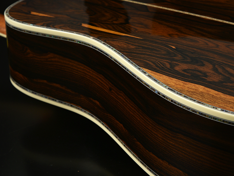 ボディサイド・バックに使用されたのは長野県松本市内でとれた桜材。適度に優しいニュアンスを持つ桜ギターのサウンドですが、ARS(アドバンスドリアシフト)Xブレイシングの影響からか、立ち上がり良く、音の粒立ちも揃いました。見た目の個性的な印象とはうらはらに、素直なサウンドが特徴です。