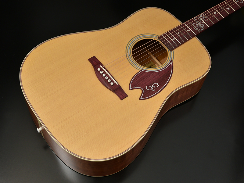 ヘッドから指板、ピックガード、ブリッジには「パープルハート」という紫色の希少材をナチュラルカラーで使用しました。硬い材質の為、鋭いアタックと豊かなサスティンが得られます。桜のイメージともマッチした自然なパープルの色合いがより一層インレイを引き立てます。