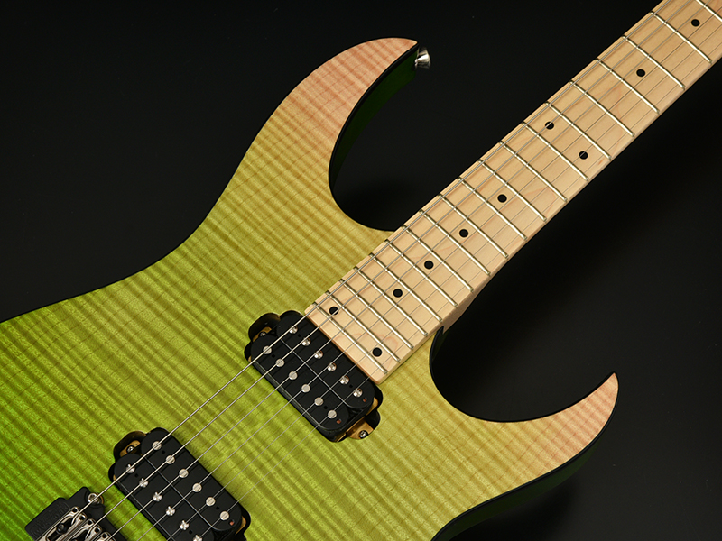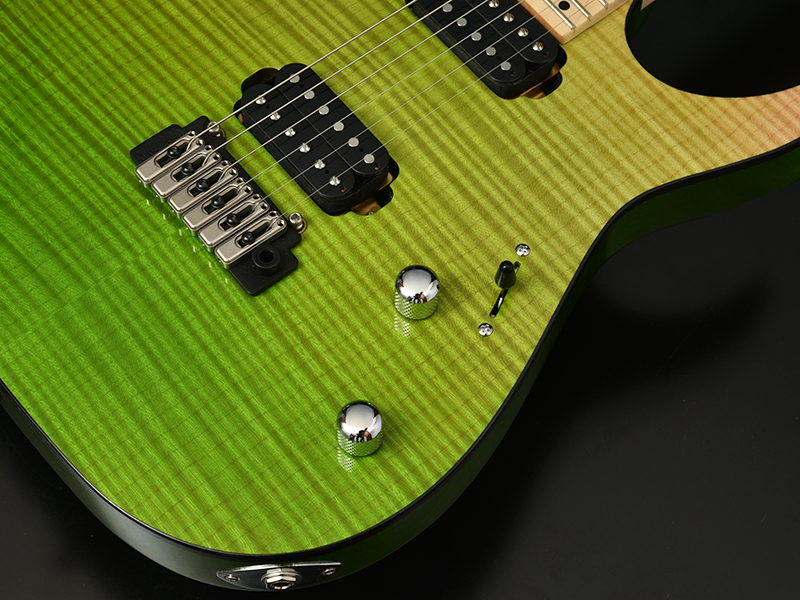 ボディトップにフレイムメイプルを採用し、ボディバックにはマホガニーを採用しています。フレイムメイプルの杢目とグラデーションカラーが目をひく華やかな外観に仕上がっています。