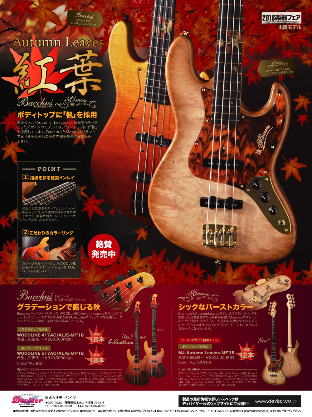 ベースマガジンの一番最後のページにあります広告では、上記と同じく「MJ-Autum Leaves-MF'18」と「Bacchus Handmade Series WOODLINE Autum Leaves」モデルを掲載。