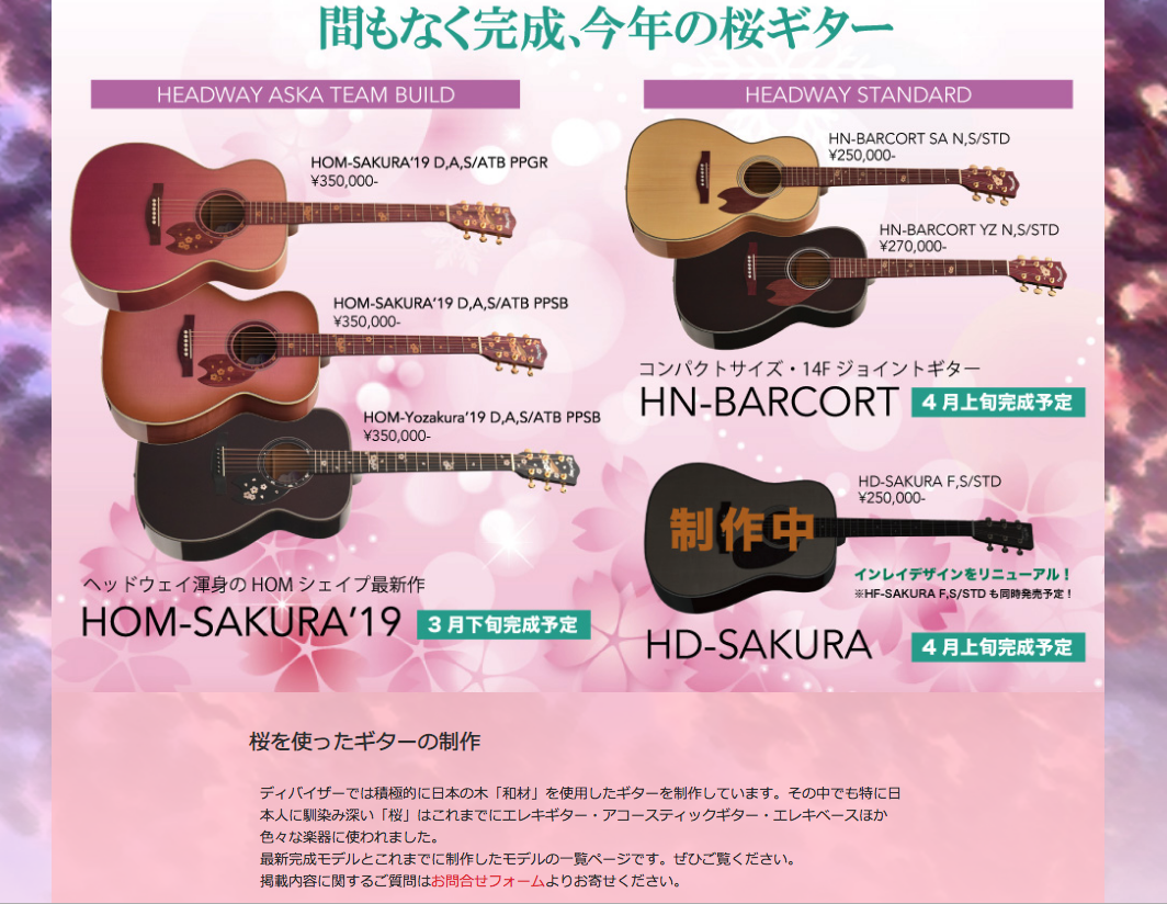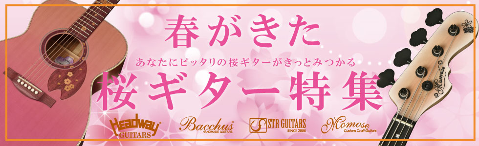 Headway、Momose、Bacchus、STR、SeventySeven各ブランドの桜ギターを一挙に見れるうえ、最新モデルの情報も公開中!