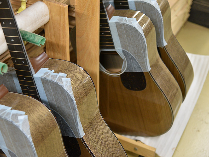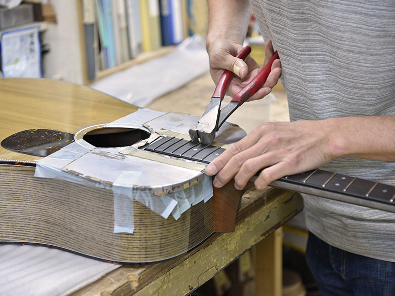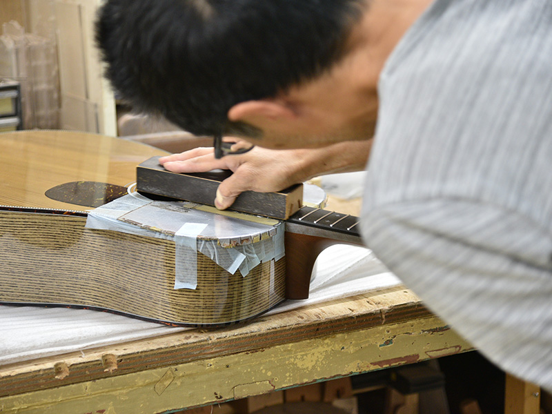神代杉ならではなのでしょうか、倍音が抑えられたスッキリとした発音が印象的です。制作時点での板の感触から、ボディの箱全体は少し鳴りすぎる様な印象があり、ノンスキャロップ・アドバンスドリアシフトブレイシングという硬めの仕様で鳴りを抑える方針に。