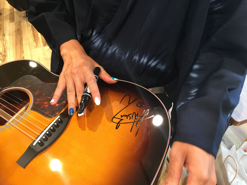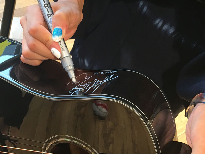当日ご購入して頂いたお客様のギターにサインを入れるおさむらいさん。