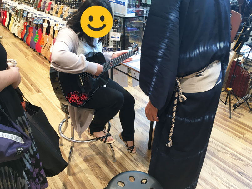 HM-OSAMURAISANを試奏するお客様。「実際に抱えてみると体にフィットして弾きやすい」と言っていただけました。