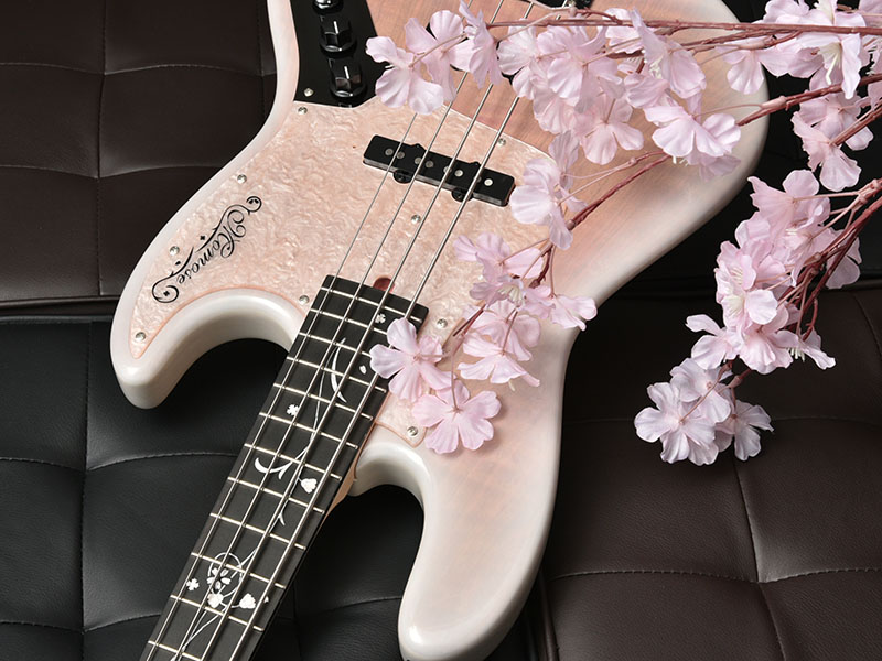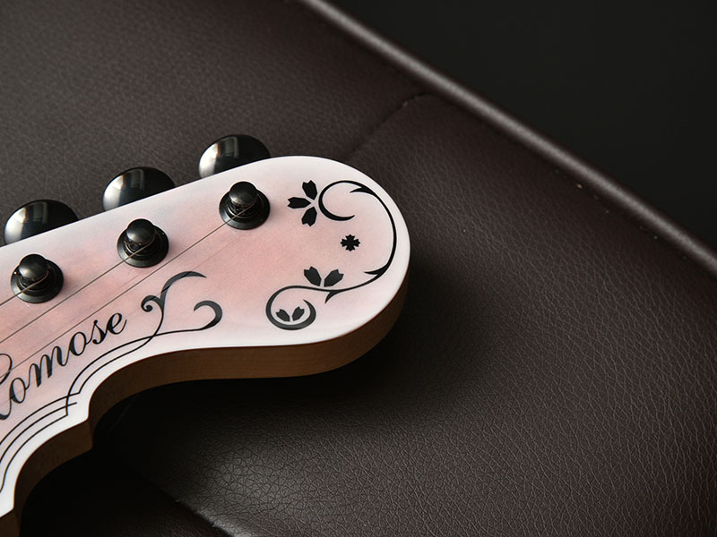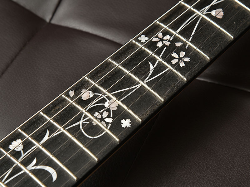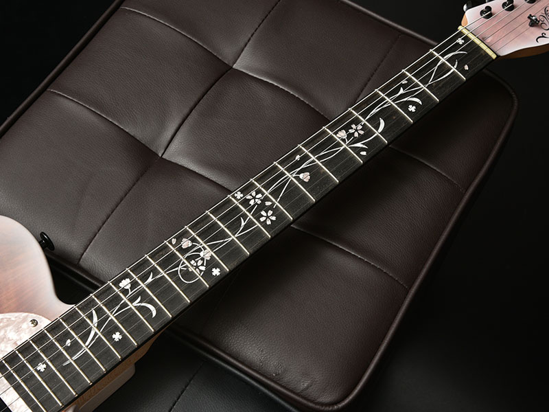 指板全体に及ぶインレイのイメージを引き継ぎインレイを入れることで、モデル全体で冬桜を表現し完成度を高めています。