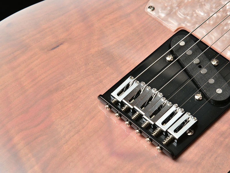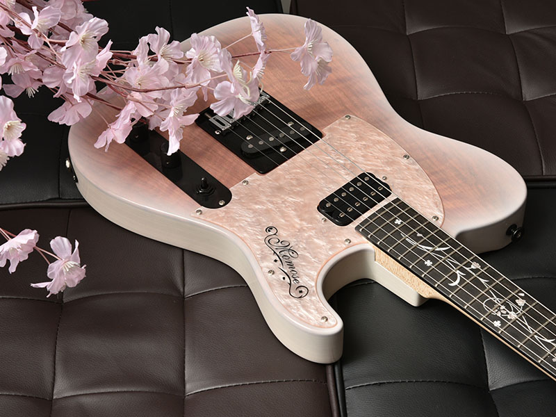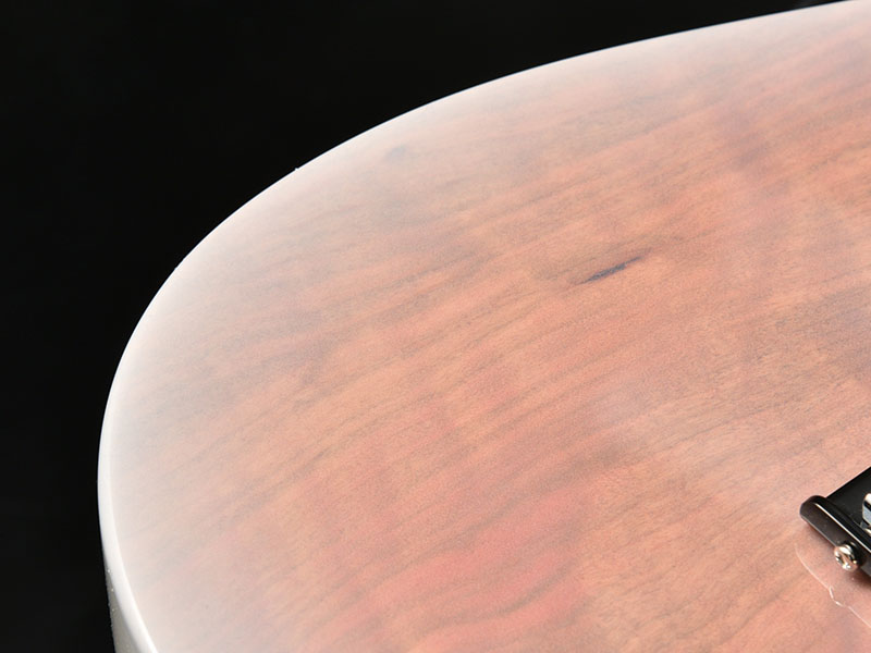 ボディ中央の桜色部分はトップに使用している桜材のフレイム杢を際立たせる為、木地着色を行うことで桜材特有の杢目を味わうことの出来る仕上がりになっております。