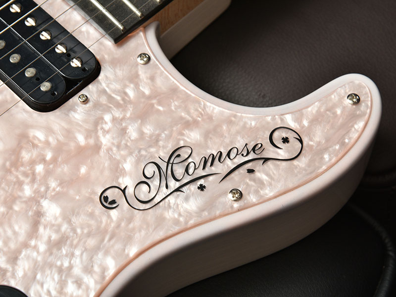 また、ピックガードもボディのカラーに合わせてピンクパール材を使用しており、このモデル特有の雰囲気を生み出しております。