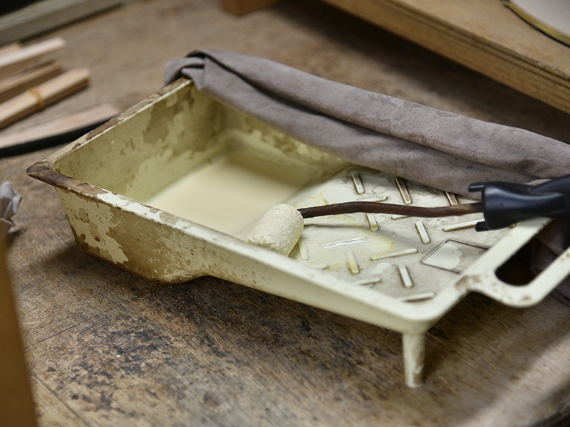 ボディトップ板を固定する大きな木枠と板バネを使って力木を接着します。