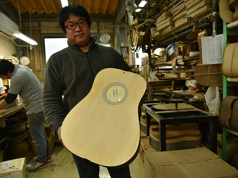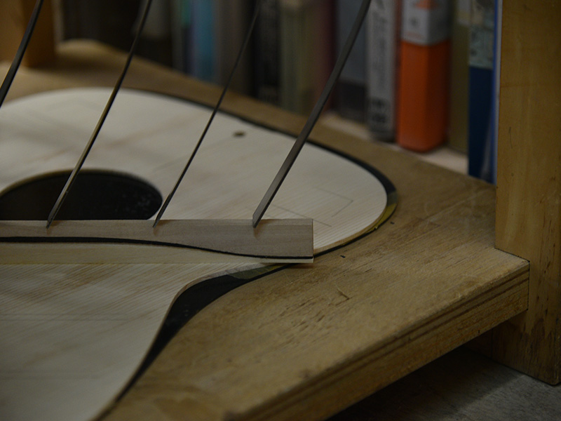 前回手押し鉋盤(かんなばん)という機械で板を薄くし、トップ材に使用できるまでに素材を整えていた赤蝦夷松ギターですが、2019年末ごろにボディトップへ力木を接着する作業が進んでおります。