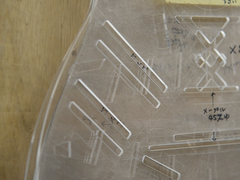 ギターのシェイプに合わせてアクリルの型を使用し、ボディトップ材の赤蝦夷松(アカエゾマツ)に力木を配置するための線を下書きしていきます。