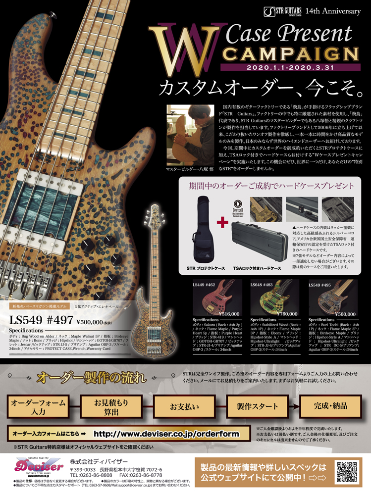 広告では、新製品紹介にも掲載のあるSTR Guitars「LS549 #497」をメインイメージに、現在開催中のSTR Guitars Wケースプレゼントキャンペーンを紹介しております。