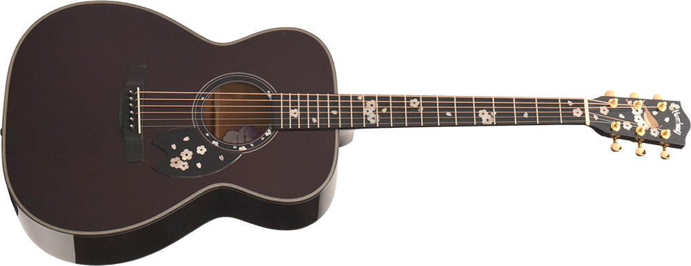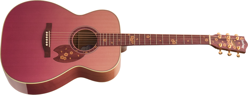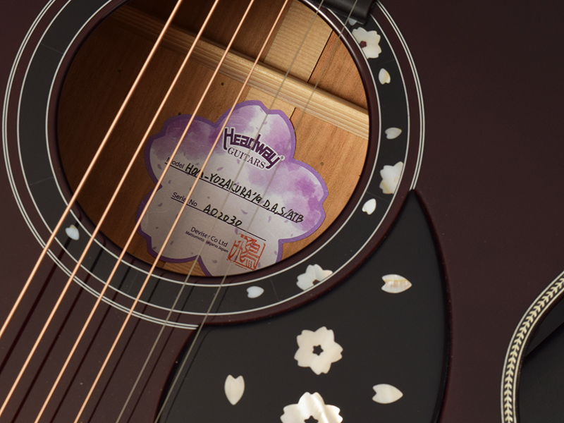 サウンドホールラベルには、桜の形をしたオリジナルデザインを採用。ボディカラーとマッチした淡い紫色を採用しています。