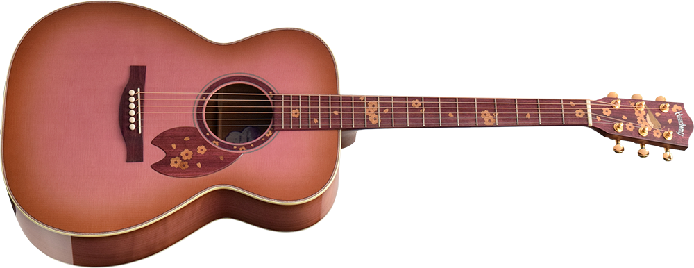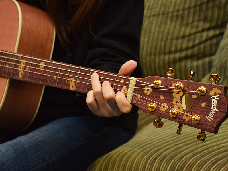 そして、桜ギターモデルでは初の試みである「ロゼッタへのインレイ」を施しています。ヘッドからピックガードまで桜の花びらが舞い散るようなイメージでデザインされています。