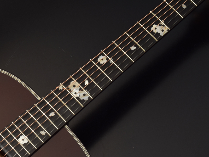 ボディのサイドバック材には桜の木を使用しています。適度に優しいニュアンスを持つ桜ギターのサウンドですが、ARS(アドバンスドリアシフト)Xブレイシングの影響からか、立ち上がり良く、音の粒立ちも揃いました。