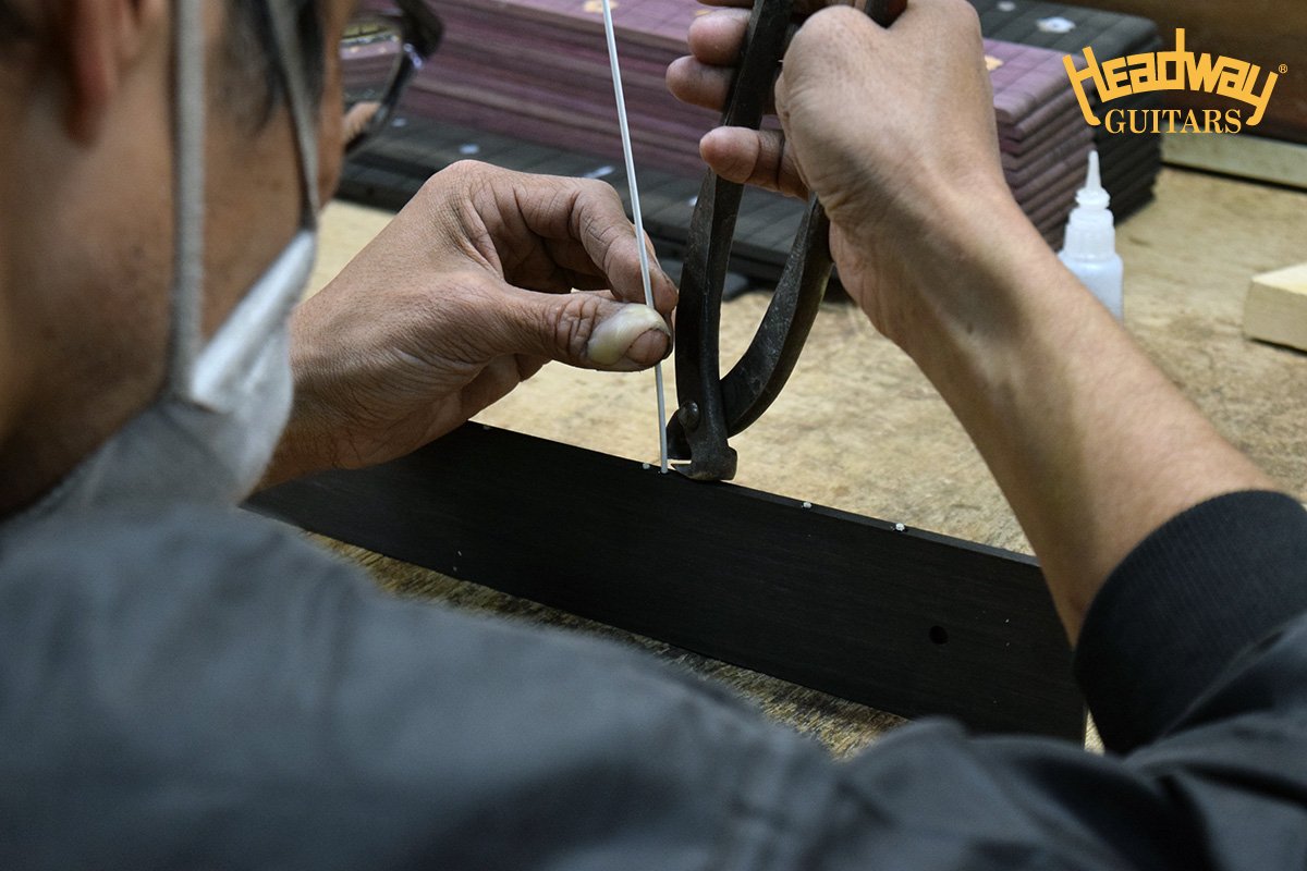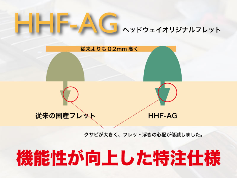 今回ヘッドウェイがフレットメーカーに特注したオリジナルフレットは一般的な「国産フレット」として表現されるものよりも硬度を上げ、さらにフレットの山を従来のフレットよりもごくわずかに(約0.2mm)高くすることで長寿命化を実現しました。