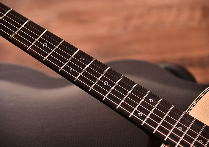 指板上のポジションマークはスノーフレークのアウトライン。トラディショナルなモチーフながら、程よくモダンな雰囲気を演出します。