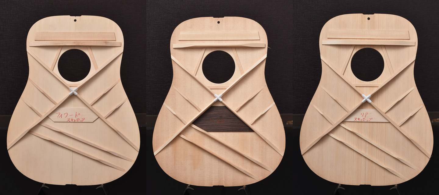 ▲ブレイシング比較イメージ・・・左からフォワードシフト、ノーマルシフト、アドバンスドリアシフトブレイシング。サウンドホールからXブレイシングの交差位置が遠のいているのが分かります。
