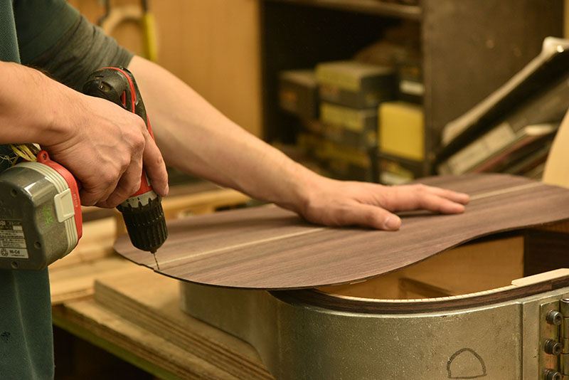 アドバンスドリアシフトはノーマルの位置から若干ブリッジ側に寄せたレイアウト。フォワードシフト、ノーマルの音の傾向を踏まえると、強度が上がり振動しづらくなることで、当初は「硬く扱いづらい音になるのではないか」という見方もありましたが、数本制作する中で得られた結果は音の芯、特に近年のヘッドウェイで少し弱かったプレーン弦(1,2弦)の鳴りに存在感が増した、という予想外の結果でした。1音1音しっかりと鳴り響き、芯のある迫力のサウンドを実現。また、位置をブリッジ側へ寄せることでトップ材に対しての丈夫さも増しています。