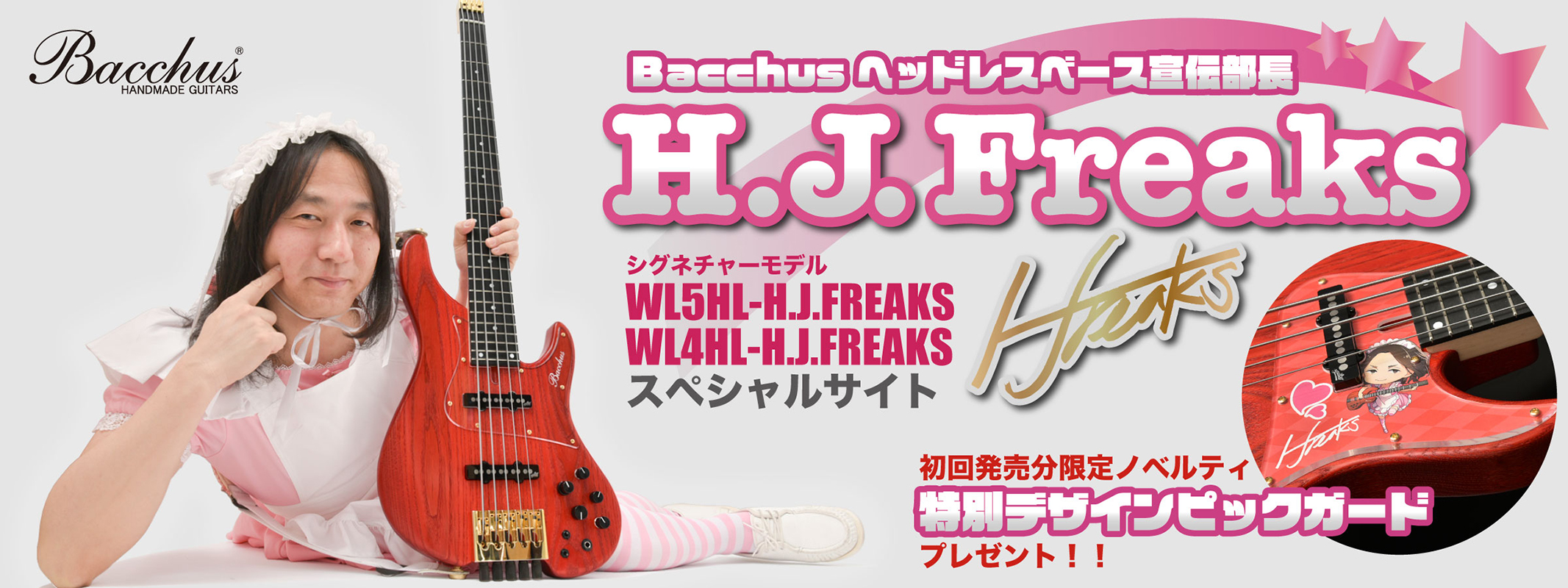 YouTubeやニコニコ動画の黎明期から動画投稿を続け、そのエキセントリックなパフォーマンスと高い技術力によって視聴者に強烈なインパクトを与えて続けてきた奇才ベーシスト「H.J.FREAKS」。そのH.J.FREAKSとBacchusがタッグを組んで開発したシグネチャーモデル「WL4HL-H.J.FREAKS」と「WL5HL-H.J.FREAKS」がこの度発売されることとなりました。BacchusのヘッドレスベースWOODLINE HEADLESSのデザインと仕様を基本としながら、H.J. Freaksが現場で必要とするサウンドと機能を求めてアップデートが施されました。プレイヤーのニーズに併せて4弦仕様と5弦仕様の2パターンが生産予定です。