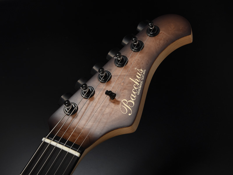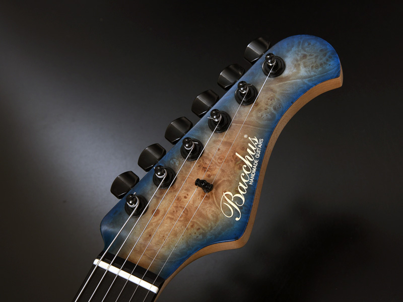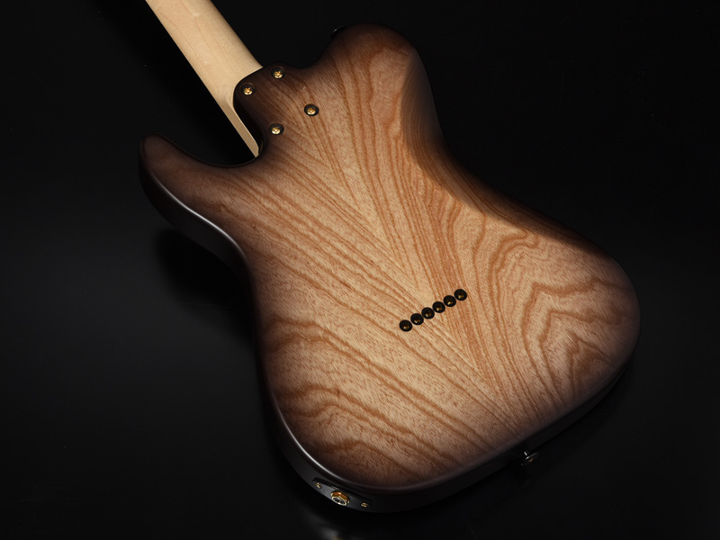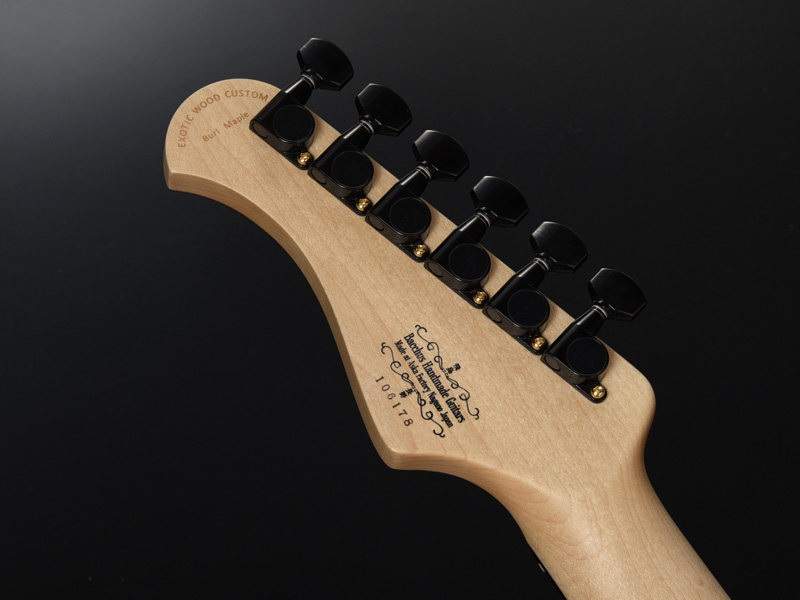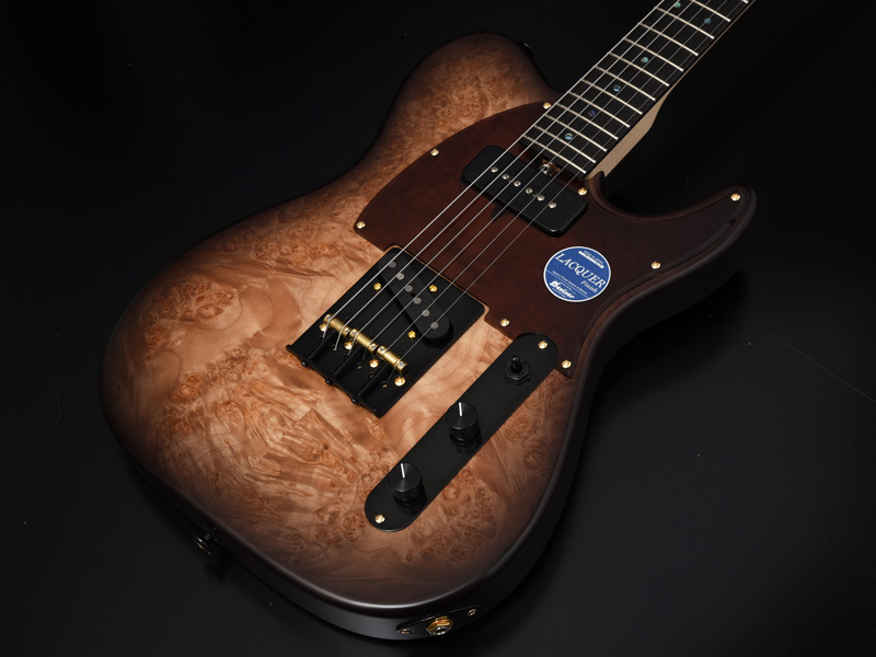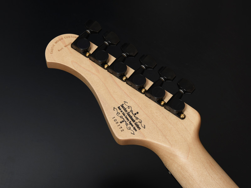 「バール杢」が細かく出たバールメイプルを使用しました。 バール杢は木の根元などに出来た心材組織とは異なる中にできる模様を指します。その瘤ができる要因や過程など判明していないことも多く、自然が作り出す複雑な模様でメイプル材の場合にはうっすらとしたインパクトの薄いものからハイエンドギターに使用されるような細く出たバール杢がそれぞれ際立つ迫力のあるものまで様々です。本モデルにはやや大きめのバール杢が細く、インパクトのある外観にその杢を際立たせるようバーストカラーを吹いています。