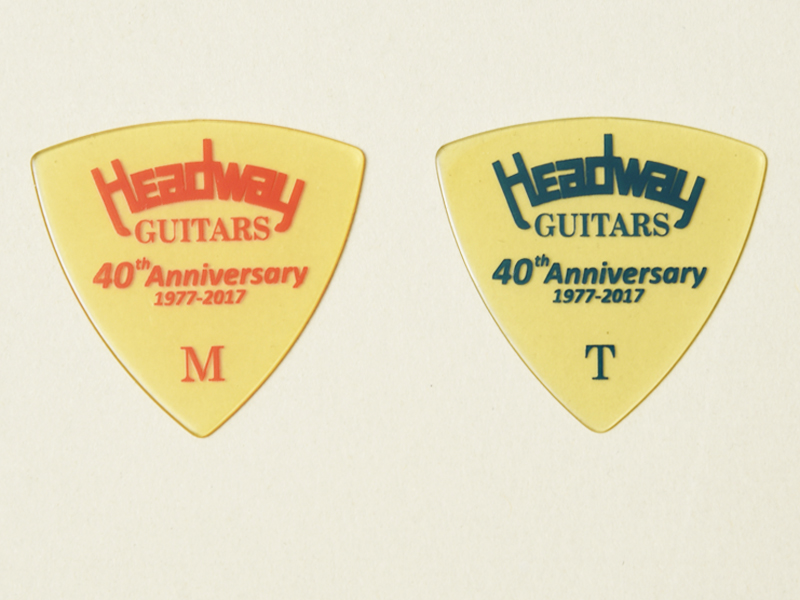 ピック中央には伝統のヘッドウェイロゴと40th Anniversaryロゴを配置。厚さのラインナップにはミディアム(0.8mm)シン(0.6mm)をご用意しています。