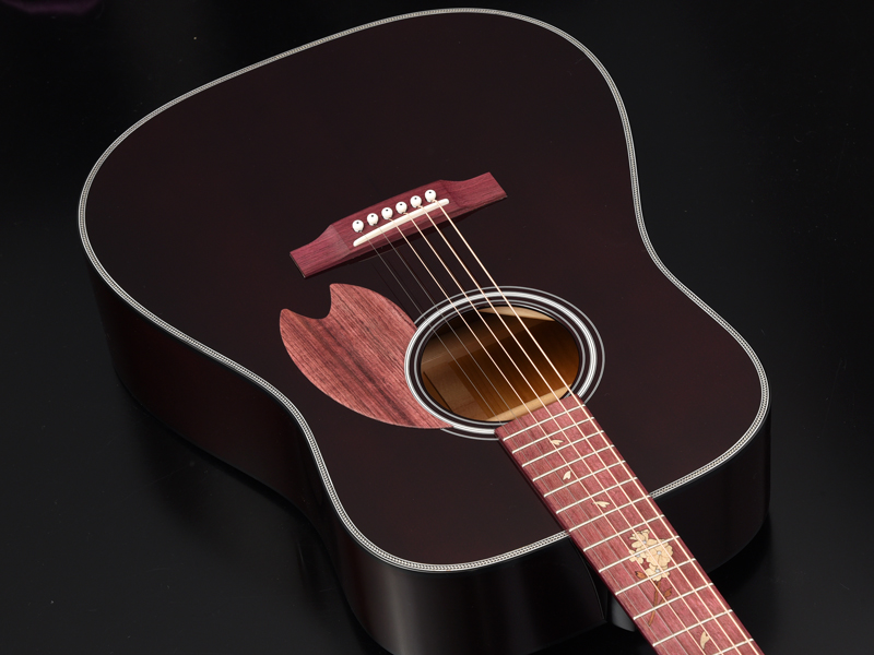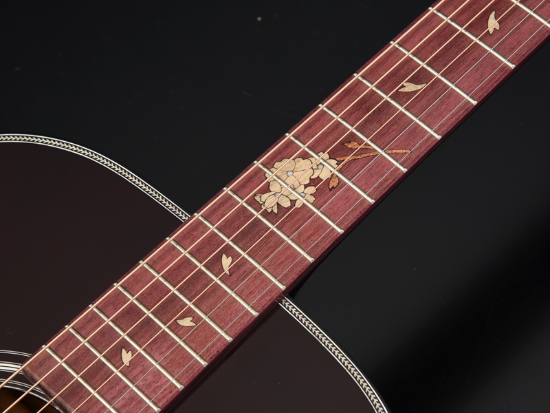 指板インレイやヘッドインレイは上品さを醸し出す桜のデザインを施し、桜の花びらをモチーフとしたピックガードには指板やブリッジと同じ「パープルハート」をオイル仕上げで使用しています。