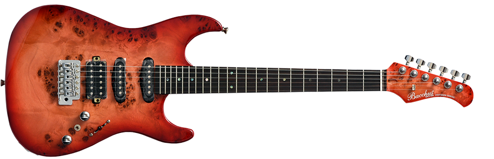 Bacchus Universe Series GS-mini BP/Rはボディにバールポプラを採用した外観も華やかな1本。こちらはミニギターになっており、スケールは570mm仕様。お子様はもちろん手の小さい方や速弾きを演奏したい方などにオススメです。スケールが短くなることでフレットの間隔も一般的なモデルより狭くなるため、弾きやすいモデルに仕上がっています。